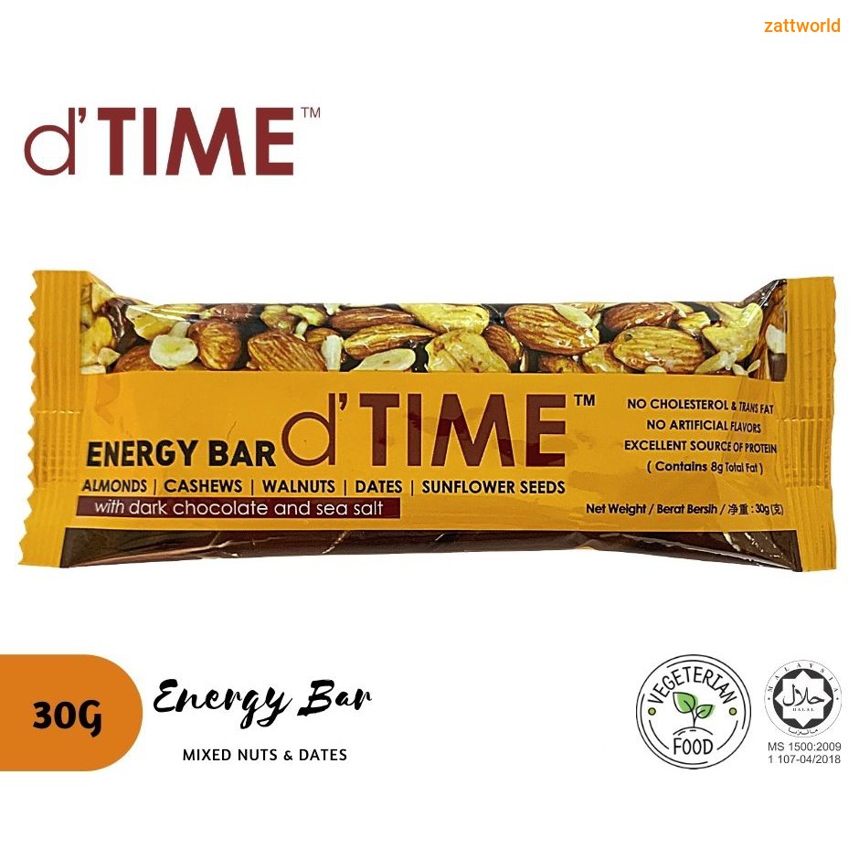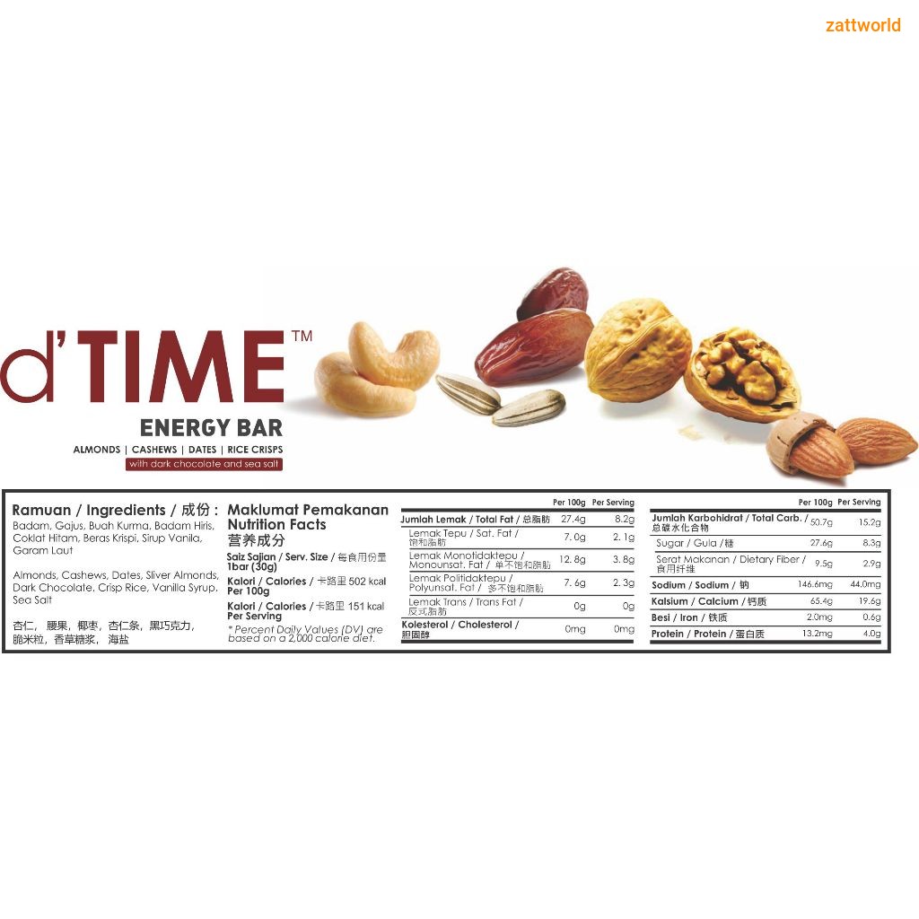 d'TIME Energy Bar contains quality almonds, cashews, dates and dark chocolate - the best compliment to the nuts. Each 30g bar contains 4g of protein and is an excellent source of fiber.
